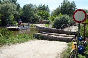 On the way back to civilization I came to a bridge that was out and you had to take a ferry across. That ferry was there for the tractors that bring wood out of the forest, and it was powered by hand on a rope that was strung across the river (not the Donau). On my way back to Sombor I decided to go to the cafe I had visited the day before for some lunch. My map on the phone showed no direct way to get there, but maps are not that accurate here I had found out before. So I went down streets, dirtroads, paths, trails ending up on a field, again. Determined not to go back around I made my way along cows over small boards laid across creeks